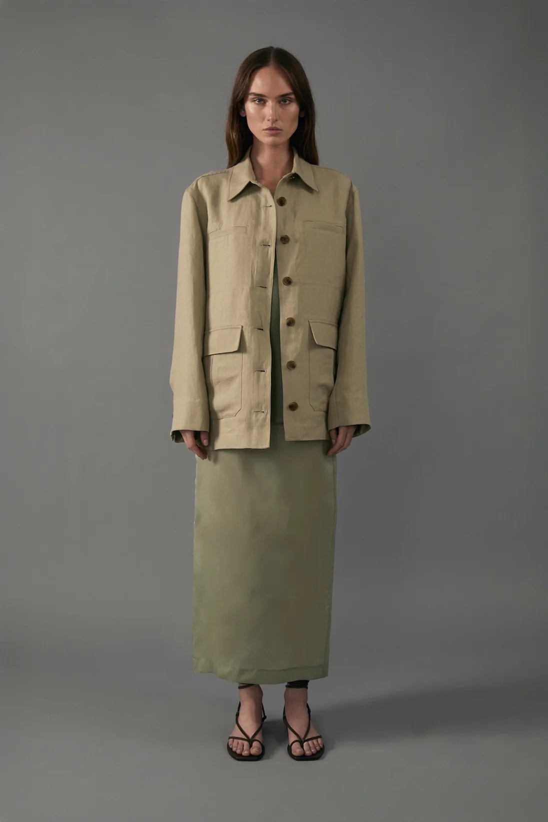 Barn jacket crafted from Italian compact linen. A classic silhouette with a modern twist, this piece features both cargo and besom pockets at the front and oversized, curved sleeves. The interior is designed with an adjustable waist tie to customize the fit, finished with a button-front closure. Designed for versatility from day to night, the jacket is unlined and meticulously detailed with a silk satin "half-moon" back yoke and waist facing.